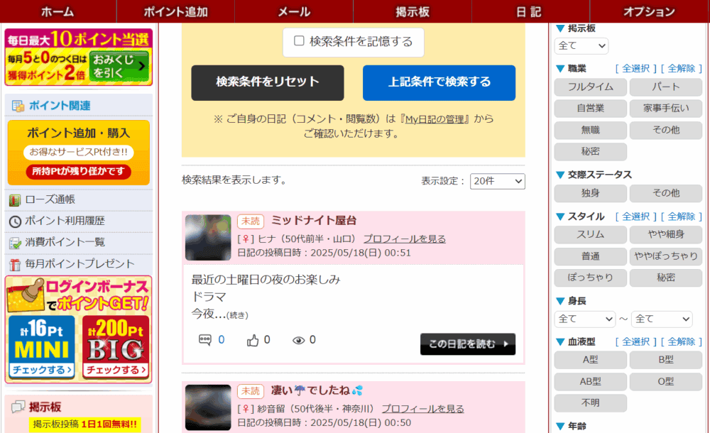 | オプション | 1pt=10円 ※女性へのメール送信10pt |